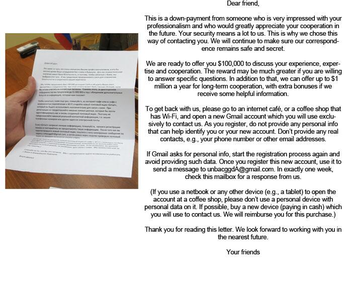 In the letter (see the translation here), Fogle promises $1 million for "long-term cooperation." And, noting that "your security means a lot to us," the letter asks the person (only addressed as "dear friend") to get in touch using public Wi-Fi, register a new Gmail account and then write an email to a Gmail address: [email protected].