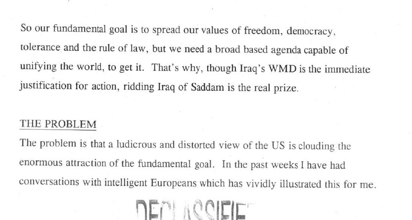 The former UK prime minister showed Bush he was keen for military action and even drafted a strategy to help convince the British public: “If we recapitulate all the WMD evidence; add his attempts to secure nuclear capability; and as seems possible, add on the Al Qaida link, it will be hugely persuasive over here. Plus..the abhorrent nature of the regime.”